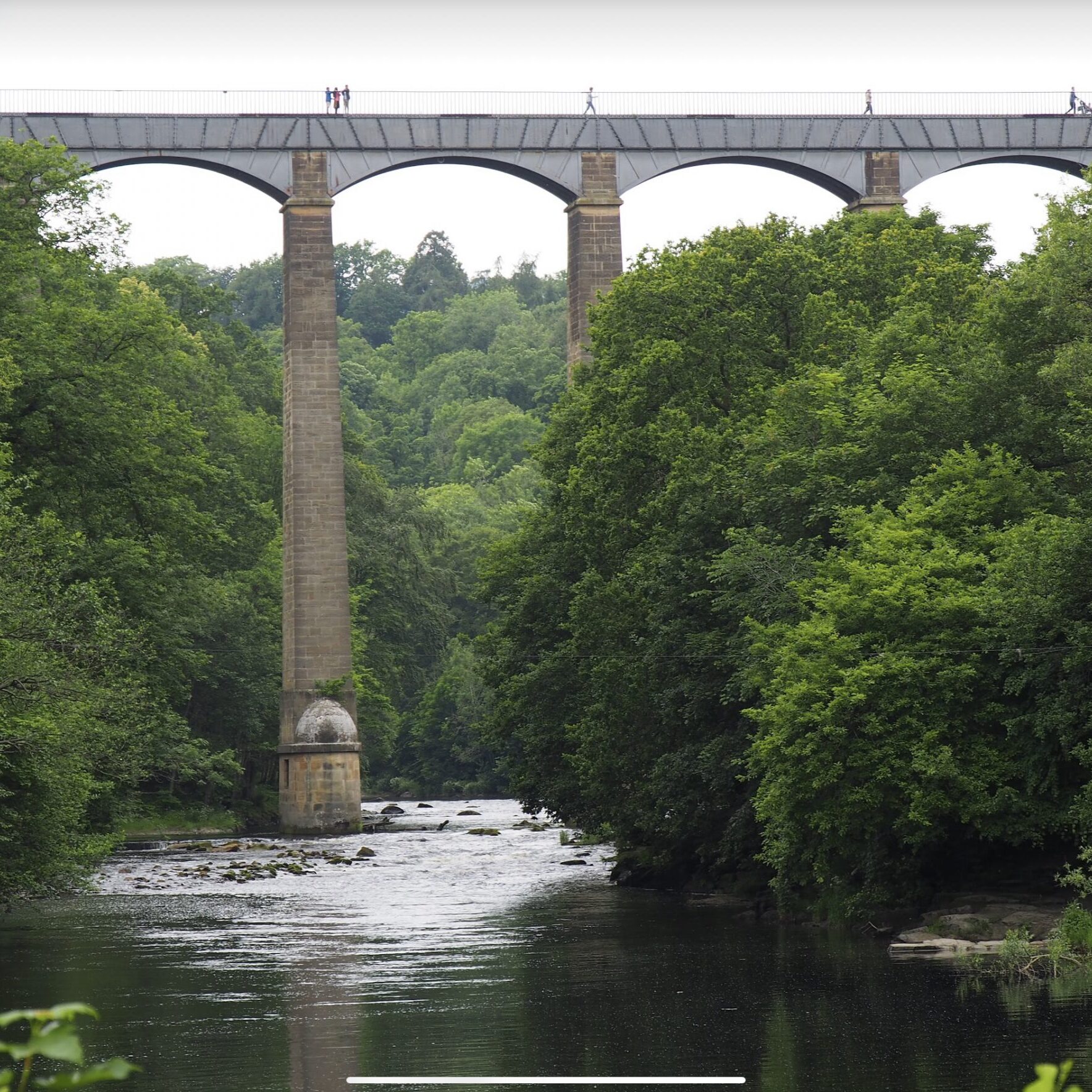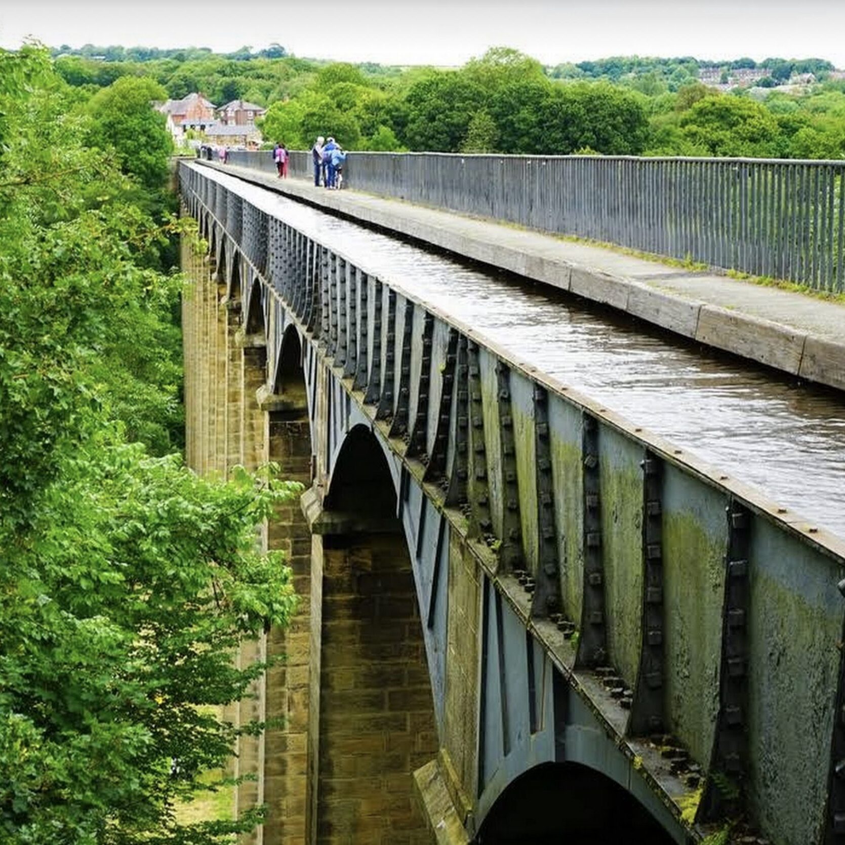 The 18-arched stone and cast iron structure which spans the River Dee is for use by narrowboats and pedestrians only and was completed in 1805 having taken ten years to design and build.