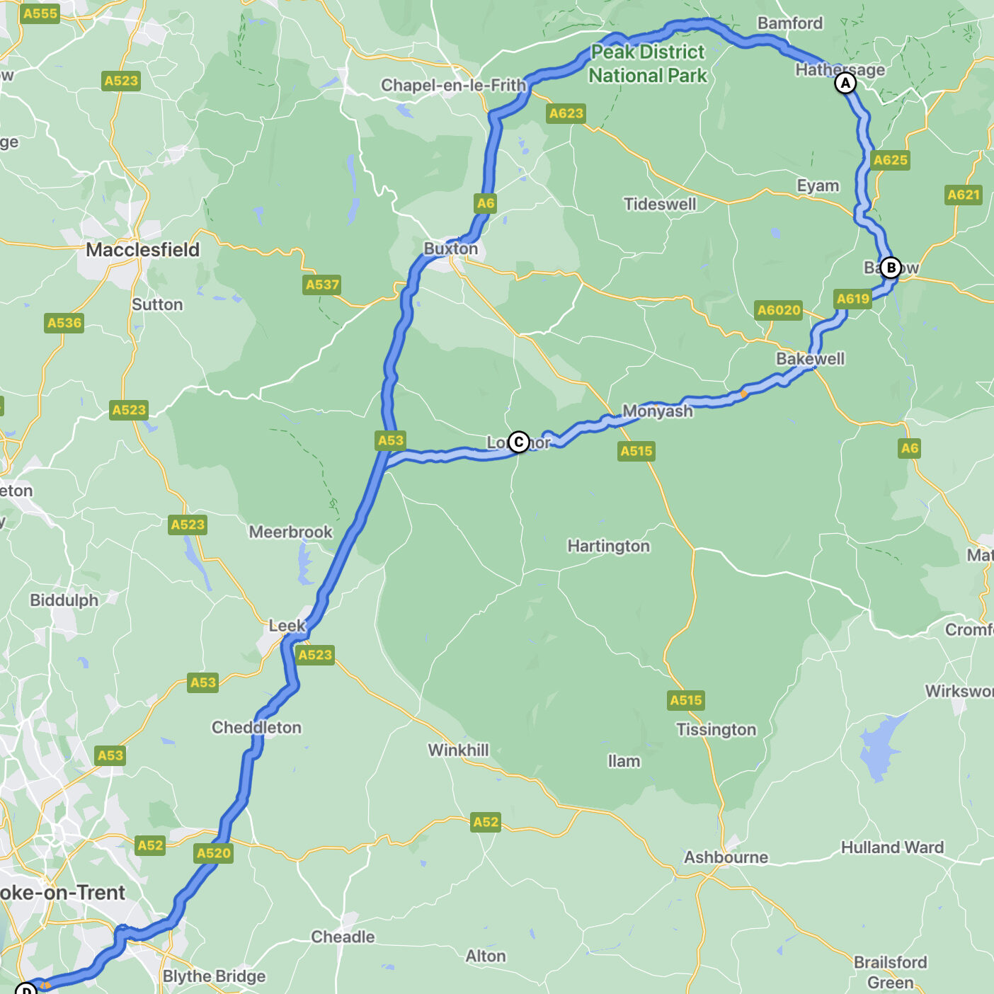 Leek – Buxton – Castleton – Hathersage – Bakewell – Monyash